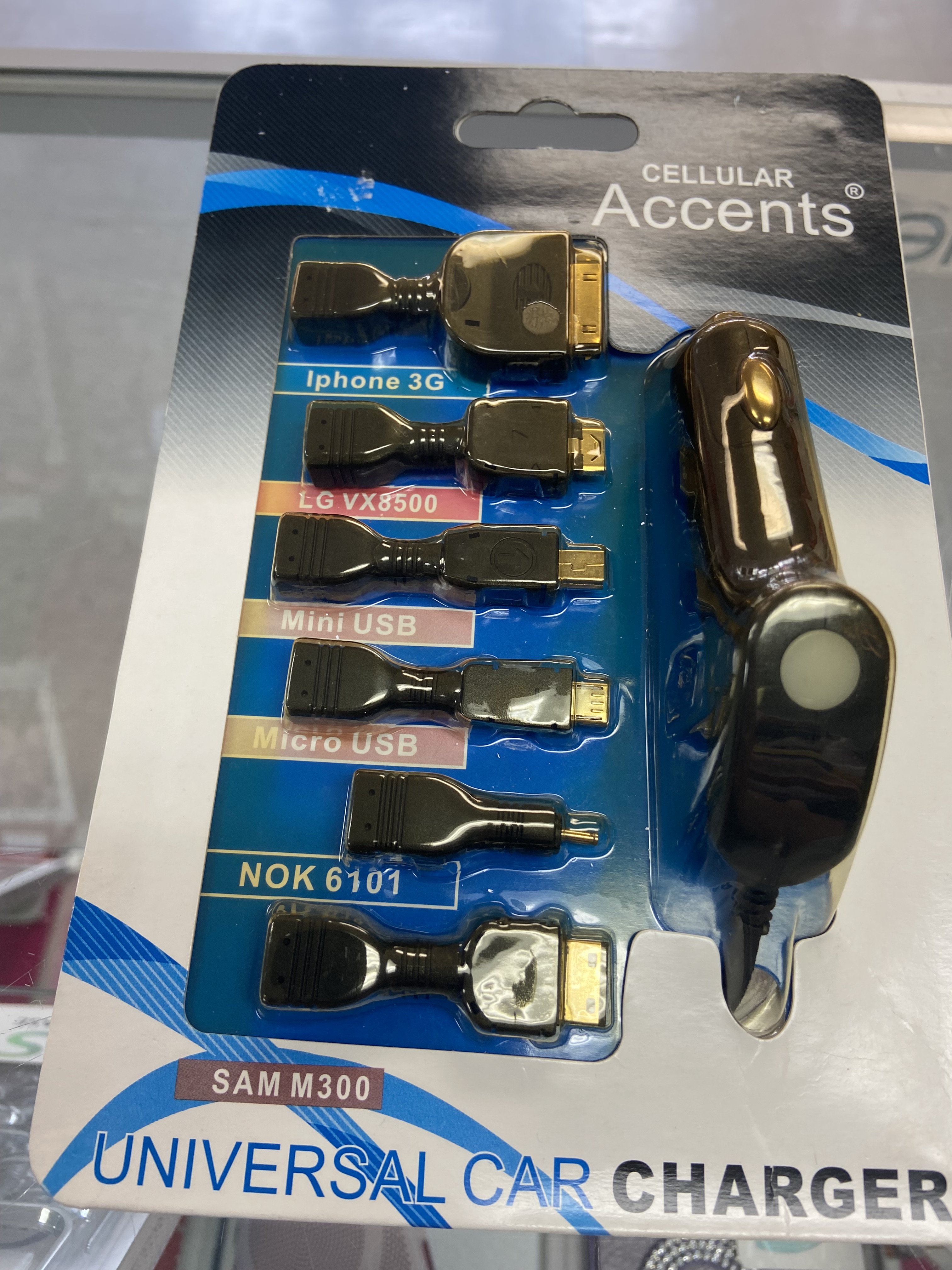 Car charger with 6 different charging knobs, work for old Nokia, Samsung and I Phones. The price includes $5 shipping & handling fee.